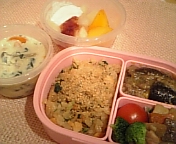 今日のお弁当は、鮭と小松菜と白ゴマの炊き込みご飯・筑前煮・