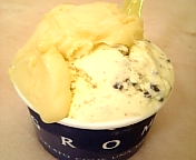 写真は「ピーチ」のソルべとビスケット&チョコチップの「グロム」。